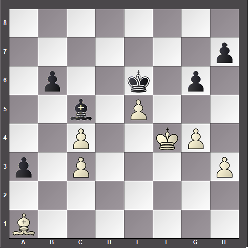Ilja had tegen Edwin zijn loper eigen moeten ingraven om de a-pion te stoppen. Het ziet er niet uit, maar Ilja zet zijn schouder eronder en wist de b-pion te ruilen en met zijn koning de a-pion te stoppen.